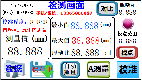 1:測量反應更快:; 2:精度更高; 3:增加最大值、厚薄比自動計算功能;4:根據(jù)客戶檢測不同需求相應A/B/C不同檢測方法;5:增加方便找瓶子最薄位置找點提示功能。6:可設定瓶子厚度數(shù)值(當瓶子厚度低于設定的數(shù)值時瓶子為不合格的):當測量值小于此值時儀器發(fā)出提示音.7:根據(jù)測量需求配備三種不同鋼珠2.2mm/3mm/5mm。